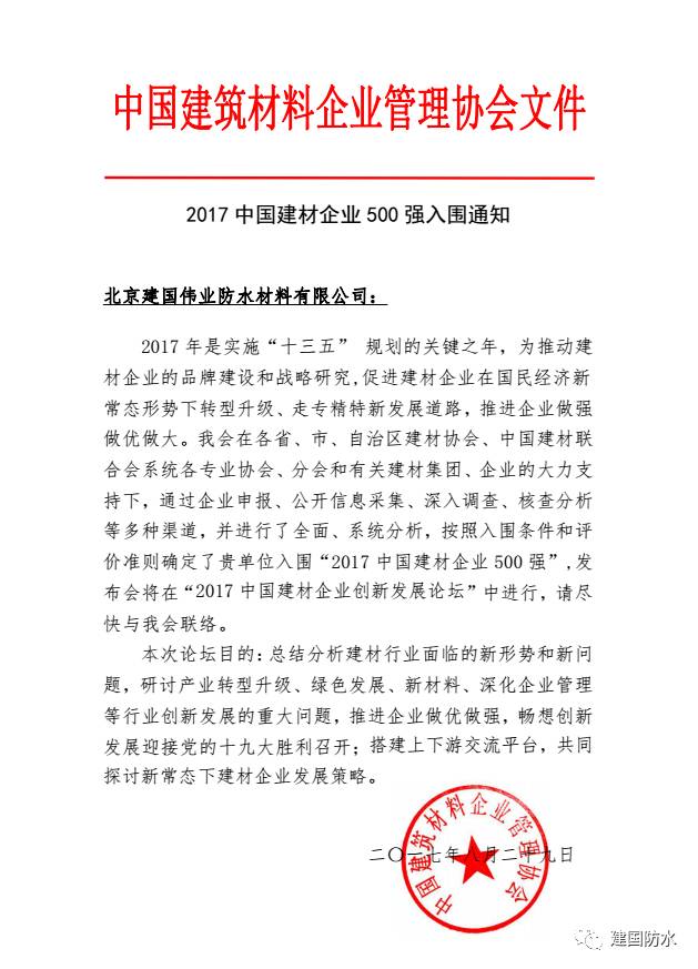 近日,中國(guó)建筑材料企業(yè)管理協(xié)會(huì)公布了“2017年中國(guó)建材企業(yè)500強(qiáng)”名單,北京市建國(guó)偉業(yè)集團(tuán)榜上有名。中國(guó)建筑材料企業(yè)管理協(xié)會(huì)是在中國(guó)人民共和國(guó)民政部登記注冊(cè)的全國(guó)性社會(huì)團(tuán)體法人組織,是具有權(quán)威機(jī)構(gòu)認(rèn)證的高質(zhì)量獎(jiǎng)項(xiàng)。