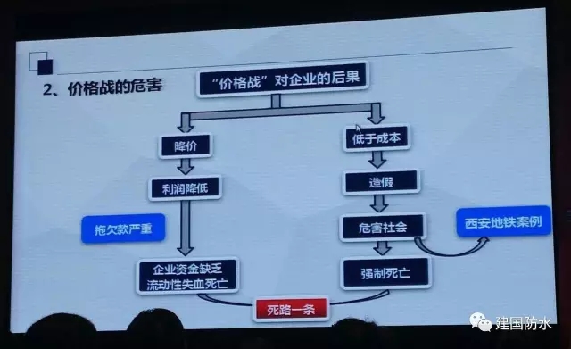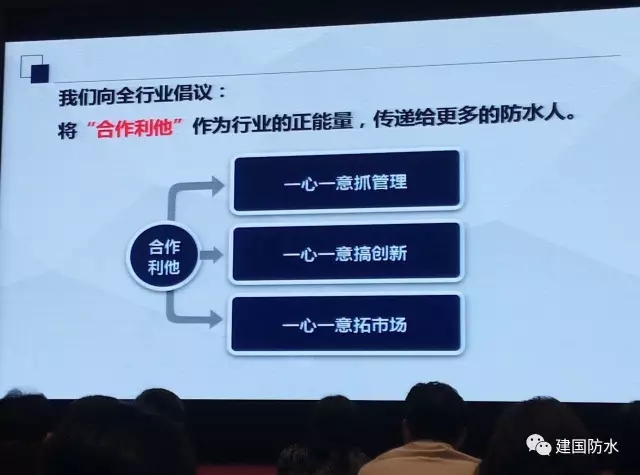楊理事長主要就三個(gè)大家較為關(guān)注的行業(yè)問題進(jìn)行分析講解,他著重強(qiáng)調(diào),企業(yè)之間打價(jià)格戰(zhàn)最終只能走向“滅亡”,號召企業(yè)要進(jìn)行創(chuàng)新,依靠新產(chǎn)品、新技術(shù)、新管理、新組織、控制原材料等取得利潤,才能使企業(yè)在嚴(yán)峻的市場環(huán)境下穩(wěn)步前行。并且向全行業(yè)倡議,將“合作利他”作為行業(yè)的正能量,傳遞給更多的防水人。